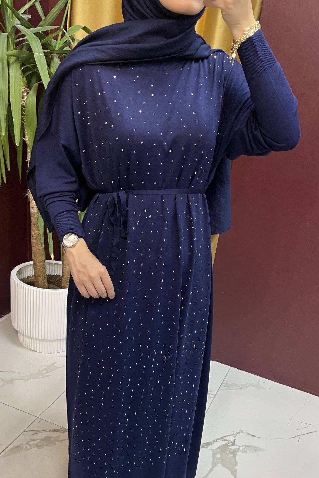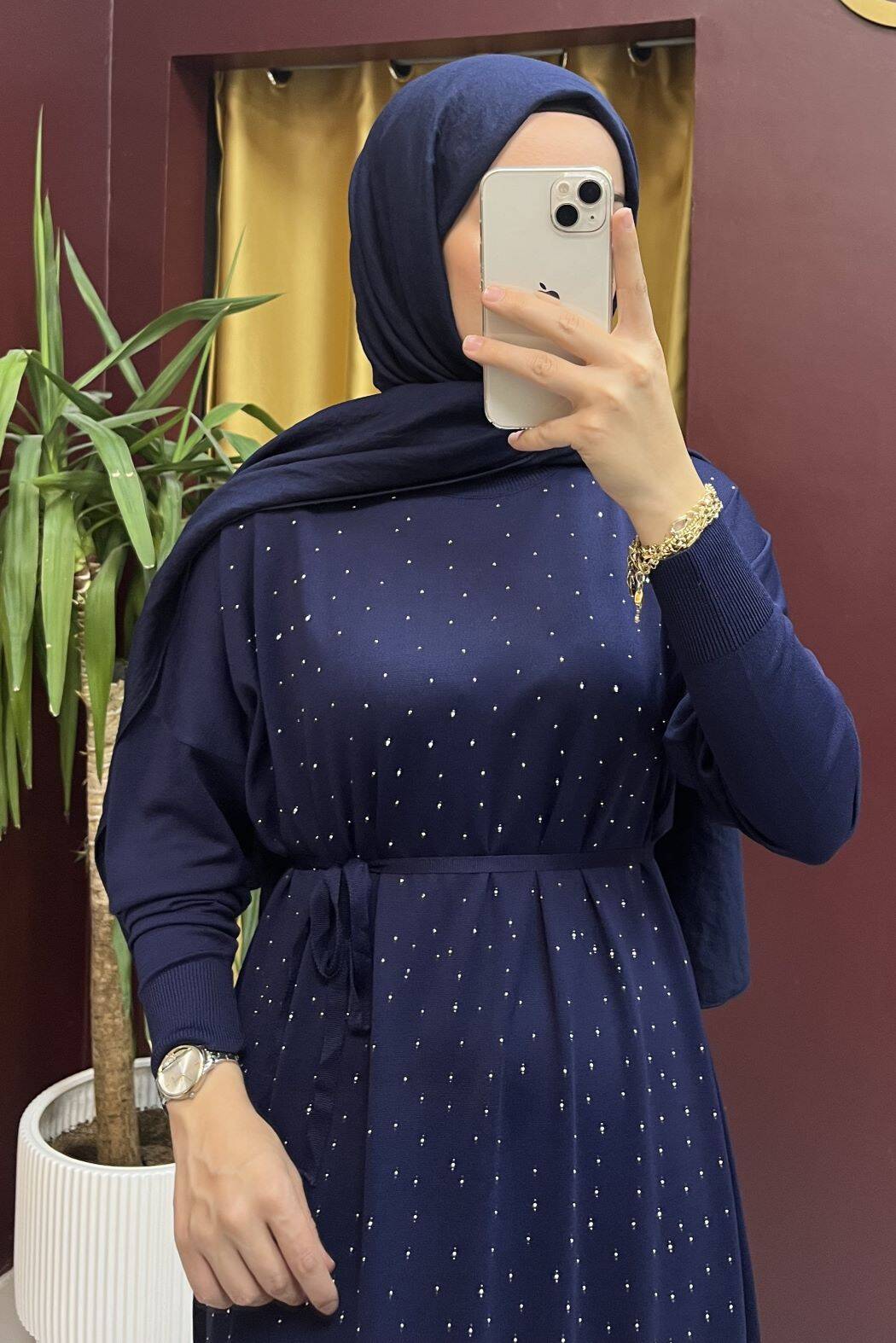 Zamansız şıklığıyla gardırobunuzun favorisi olacaktaş detaylı triko elbise dökümlü duruşuyla hem konforu hem zarafeti bir arada sunar.