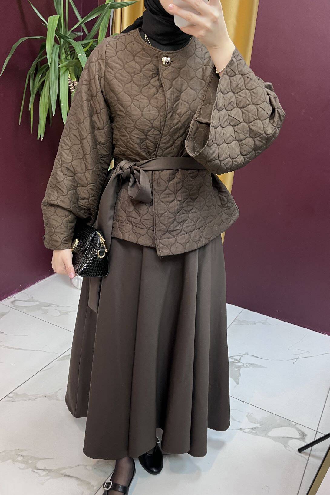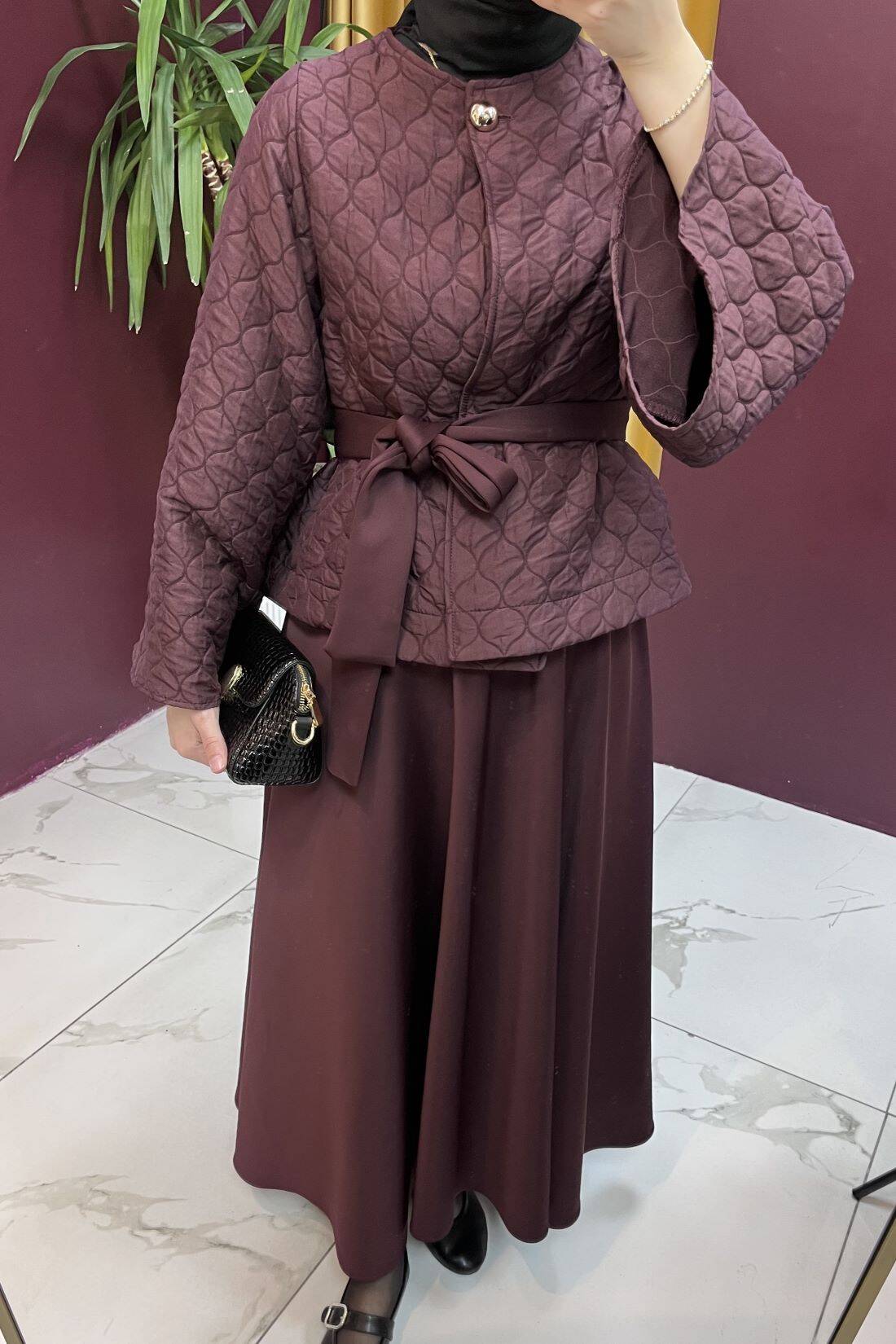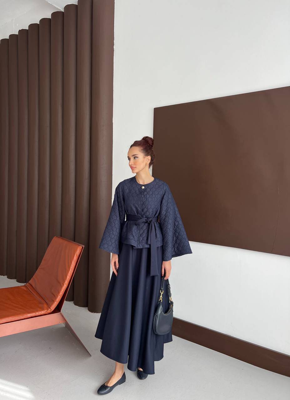 Zamansız şıklığın modern yorumu… Üst kısmı kapitone detaylı, altı akışkan scuba kumaştan tasarlanan bu takım; hem konforu hem de zarafeti bir araya getiriyor. Geniş kesim kolları ve kemer detayıyla feminen bir siluet oluştururken, tok duruşlu kumaşı sayesinde gün boyu formunu korur. Özel davetlerden günlük kombinlere kadar her anına uyum sağlar.
