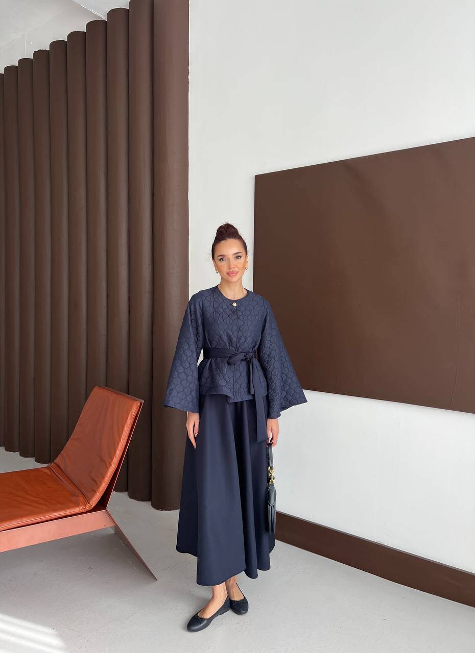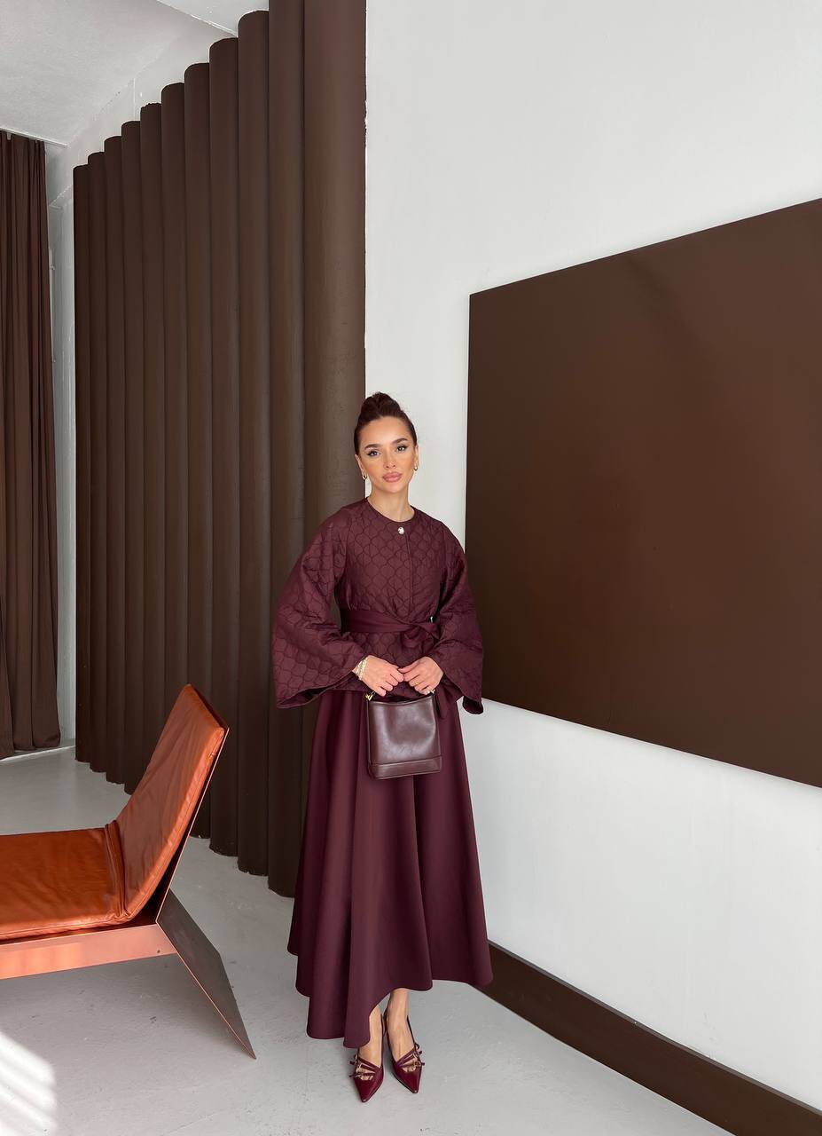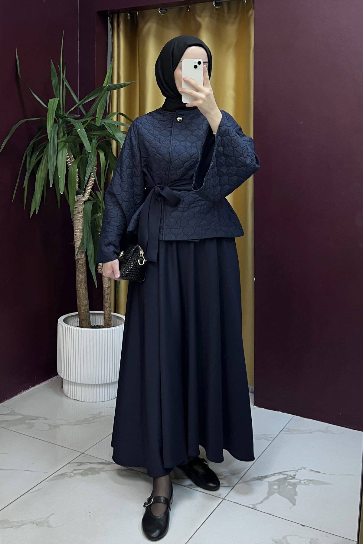 Zamansız şıklığın modern yorumu… Üst kısmı kapitone detaylı, altı akışkan scuba kumaştan tasarlanan bu takım; hem konforu hem de zarafeti bir araya getiriyor. Geniş kesim kolları ve kemer detayıyla feminen bir siluet oluştururken, tok duruşlu kumaşı sayesinde gün boyu formunu korur. Özel davetlerden günlük kombinlere kadar her anına uyum sağlar.