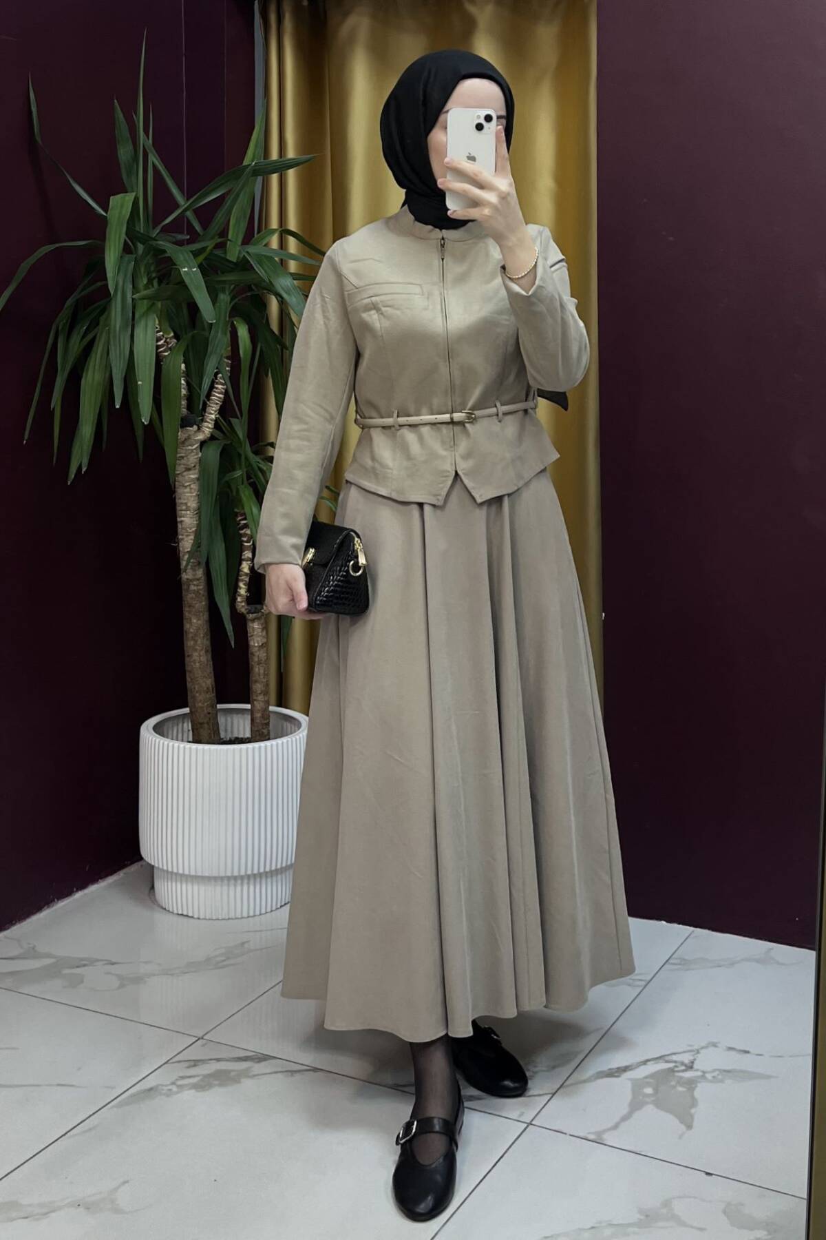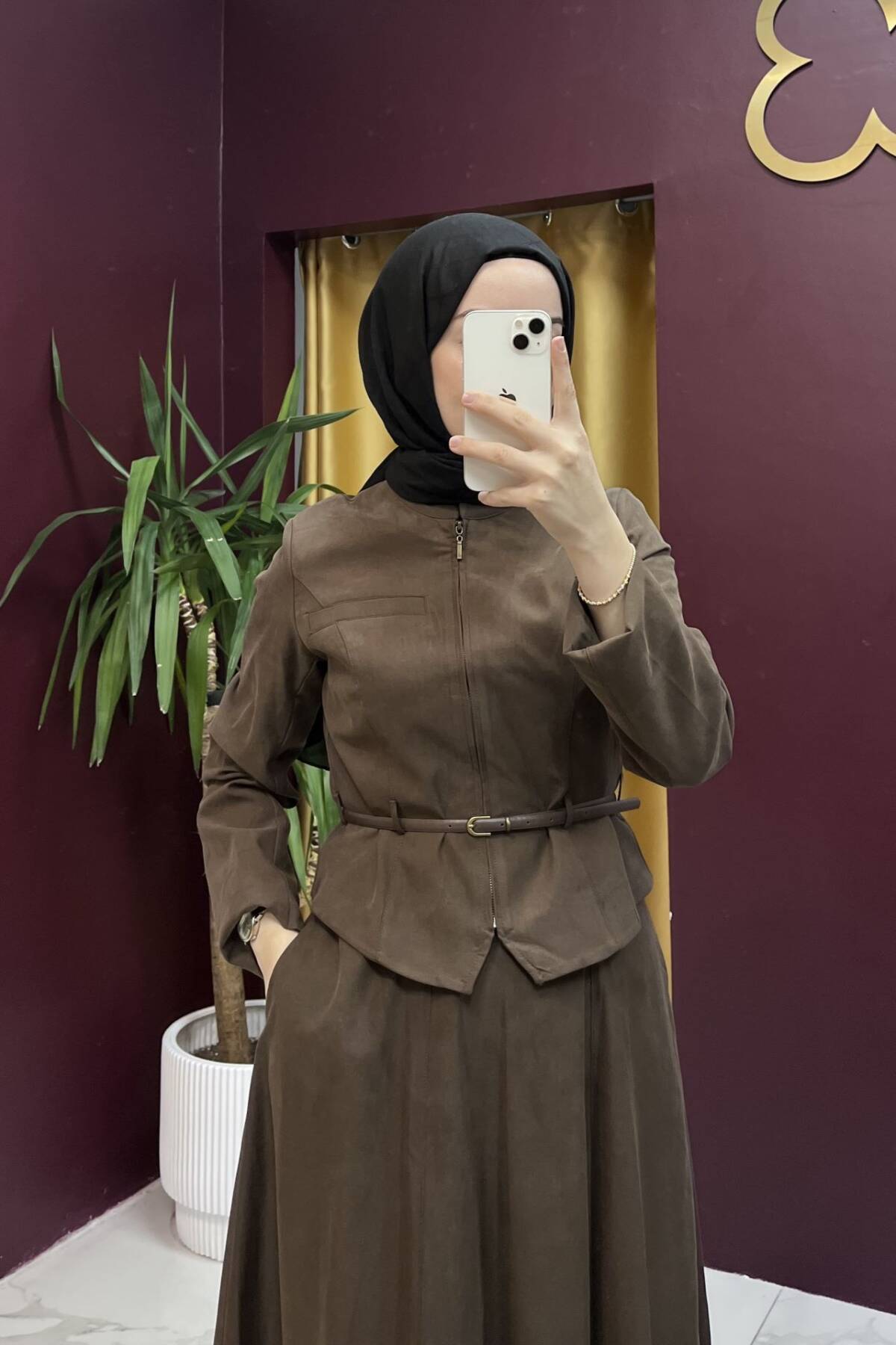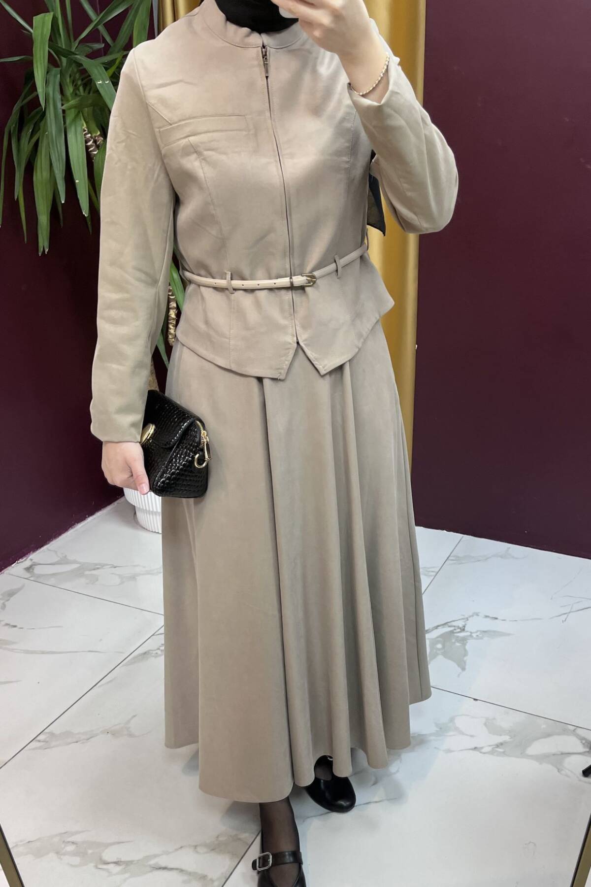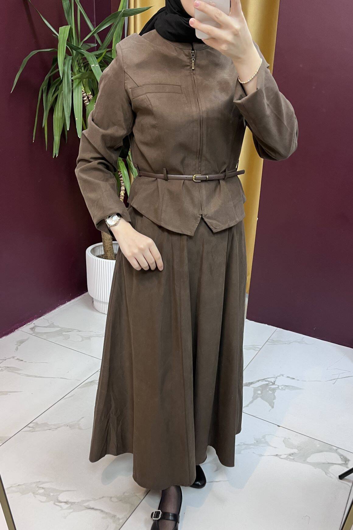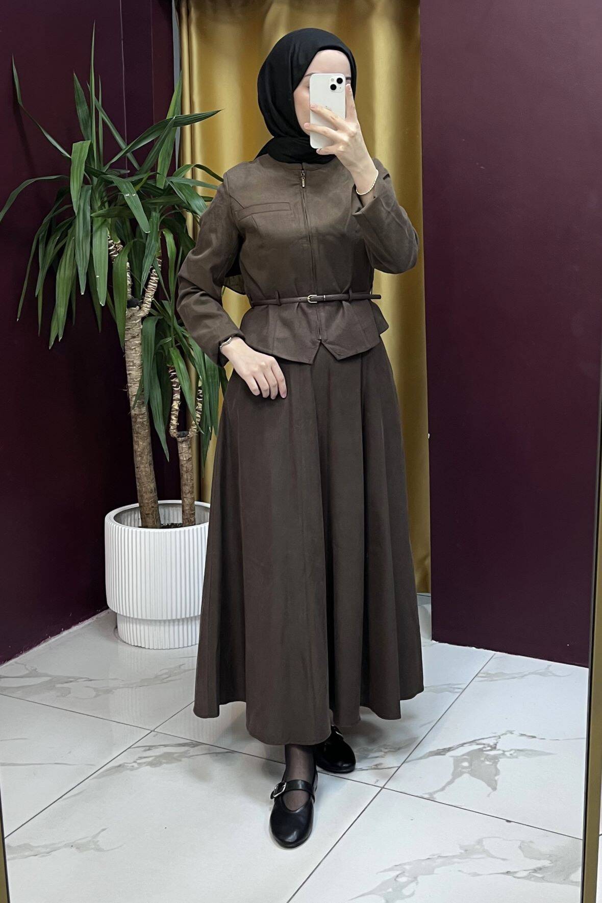 Zamansız şıklığın modern yorumunu sunan bu takım, yumuşak dokulu kumaşı ve asil kahve tonu ile hem günlük kullanımda hem de özel günlerde zarif bir görünüm sağlar. Üst kısmındaki ince kemer detayı bel formunu vurgularken, geniş kesim etek hareket özgürlüğü ve akıcı bir siluet sunar.
